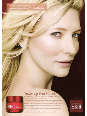 Cate Blanchett (born Catherine Elise Blachett on 14 May 1969 in Melbourne, Austrailia), is an Australian actress. She starred in the movies, The Lord of the Rings (trilogy), Elizabeth, The Aviator (Academy Award winning role). Cate is the face of SK-II beauty. In 2013 she was signed as the face of Giorgio Armani's Si fragrance campaign.