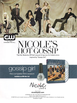 Gossip Girl is an American television series that aired Sept. 19, 2007 through Dec. 17, 2012 on The CW. The series stars actors: Chance Crawford, Blake Lively, Taylor Momsen, Ed Westwick, Jessica Szohr, and Leighton Meester. The show was based on the book series of the same name written by Cecily von Ziegesar, and created by Josh Schwartz and Stephanie Savage. The six seasons revolved around the lives of upper-class students living in the Upper East Side of Manhattan and narrated by the "Gossip Girl" blogger, voiced by Kristen Bell. In 2010 a line of nail polish colors by OPI was named after the series.