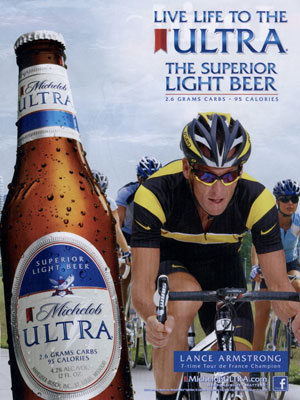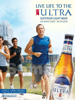 Lance Armstrong (born 18 September 1971 in Dallas, Texas), is an American professional racing cyclist. He won the Tour de France consecutively seven times. Lance is featured in Michelob beer ad campaigns (2010-).