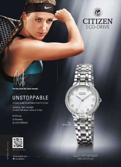 Victoria Azarenka (born 31 July 1989 in Minsk, Byelorussian SSR), is a Belarussian athlete - a professional tennis player, number 1 in the world in 2012. She is featured in the Citizen Eco-Drive watch campaign (2013).